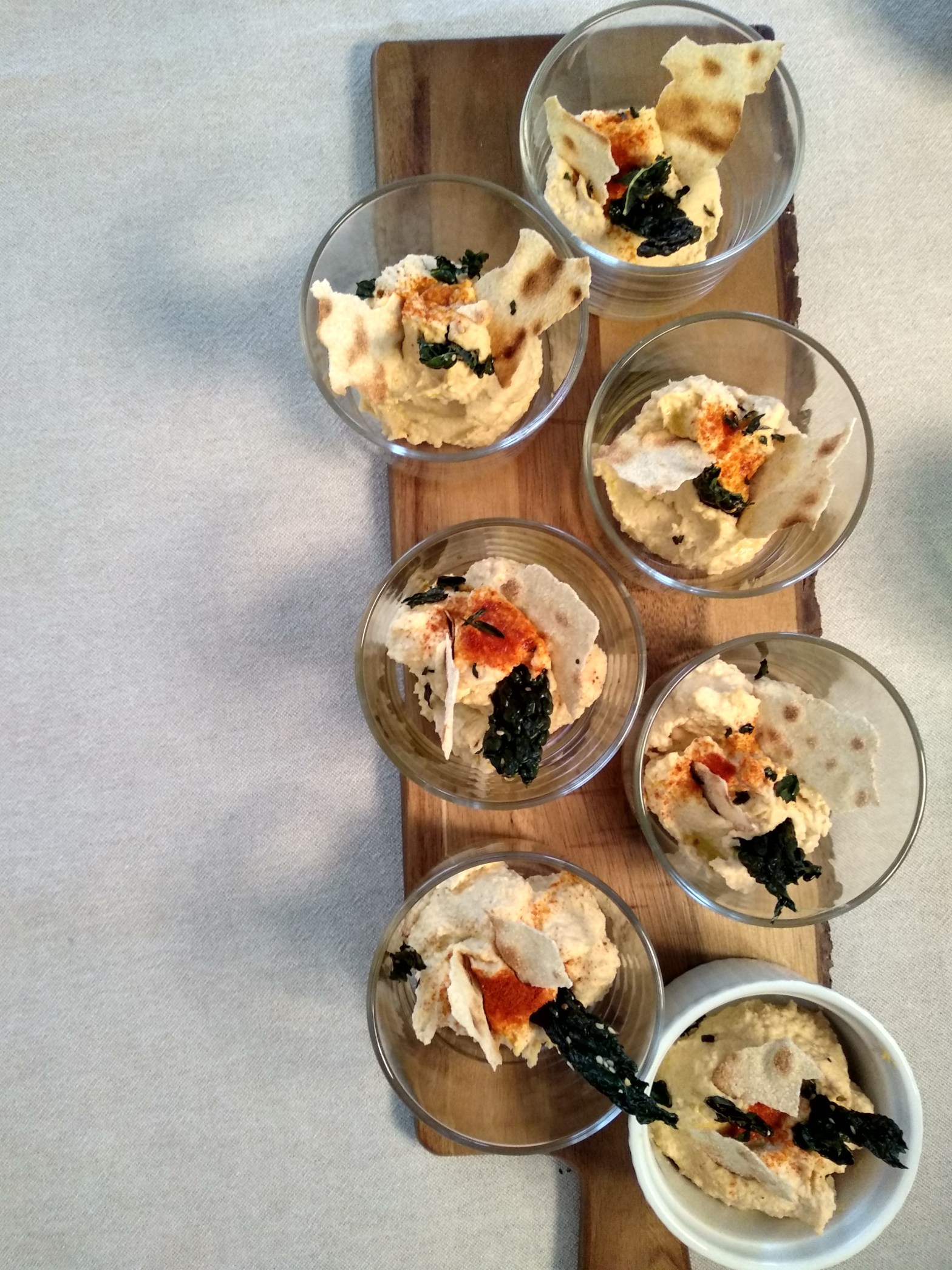 Cominciamo a spadellare, lei apre il corso con i suoi deliziosi bignè di formaggio, il suo hummus di ceci e chips di cavolo nero e combiniamo insieme un classico della cucina sarda: ricotta e miele.