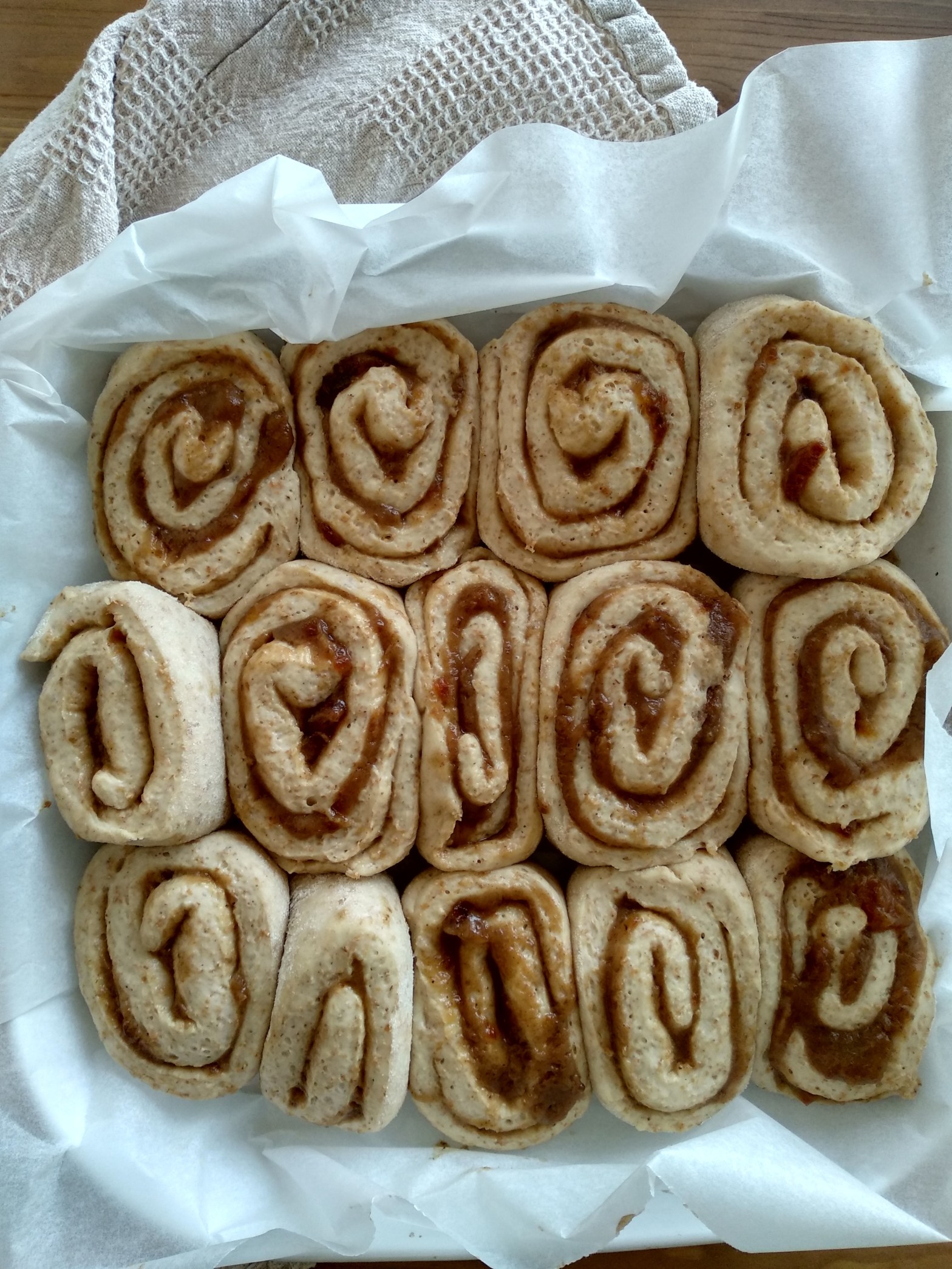 Dopo la lievitazione, stendere l’impasto, spalmare la crema, avvolgere e tagliare delle girelle da disporre in una teglia con carta forno.