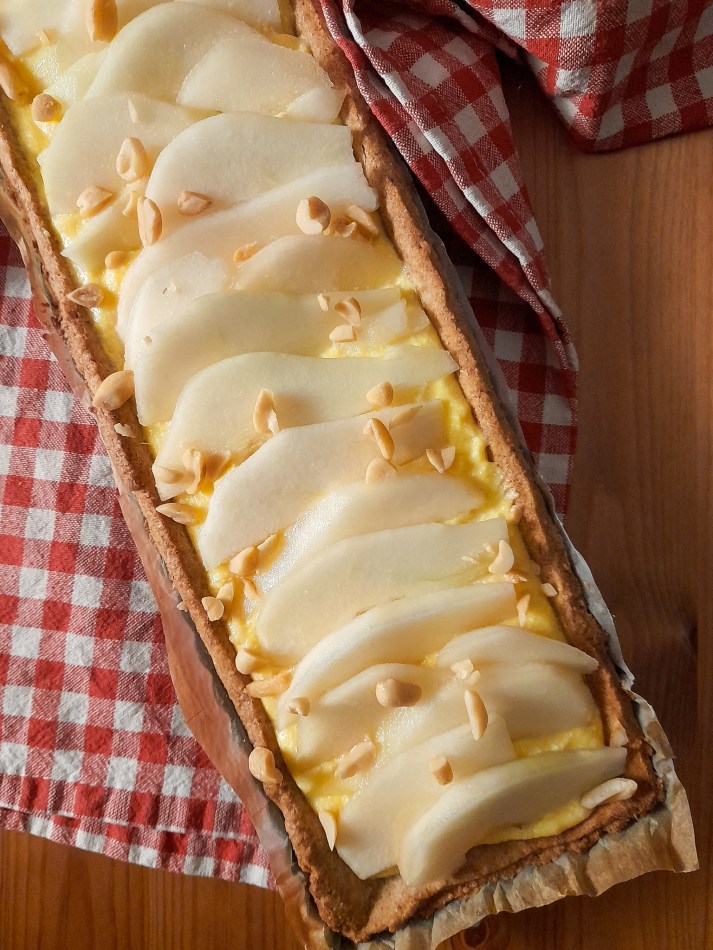 Immergere per 10/15 min le pere tagliate a spicchi nello sciroppo tiepido e tagliarle a fette solo prima di disporle sulla torta (devono rimanere sode).